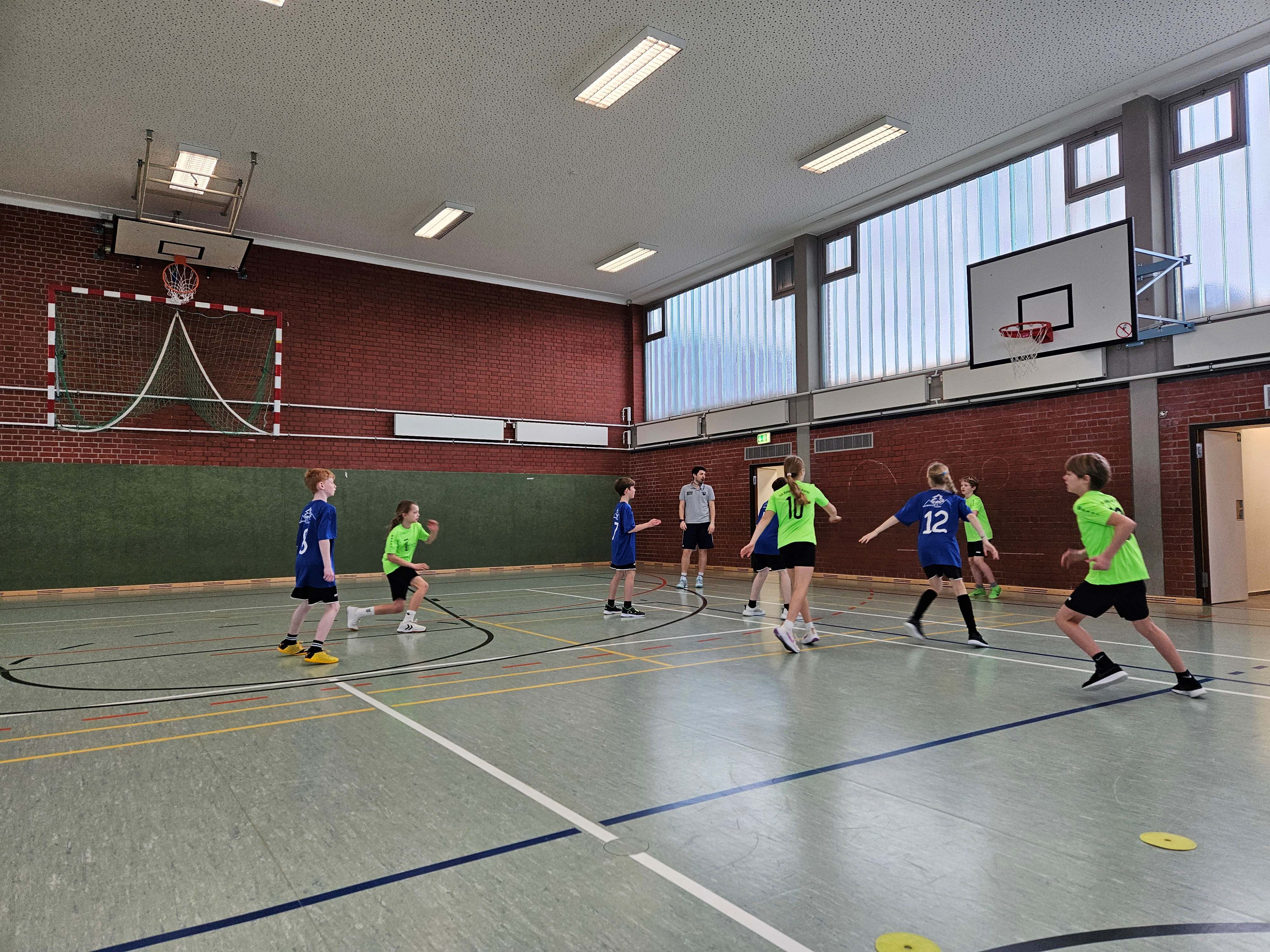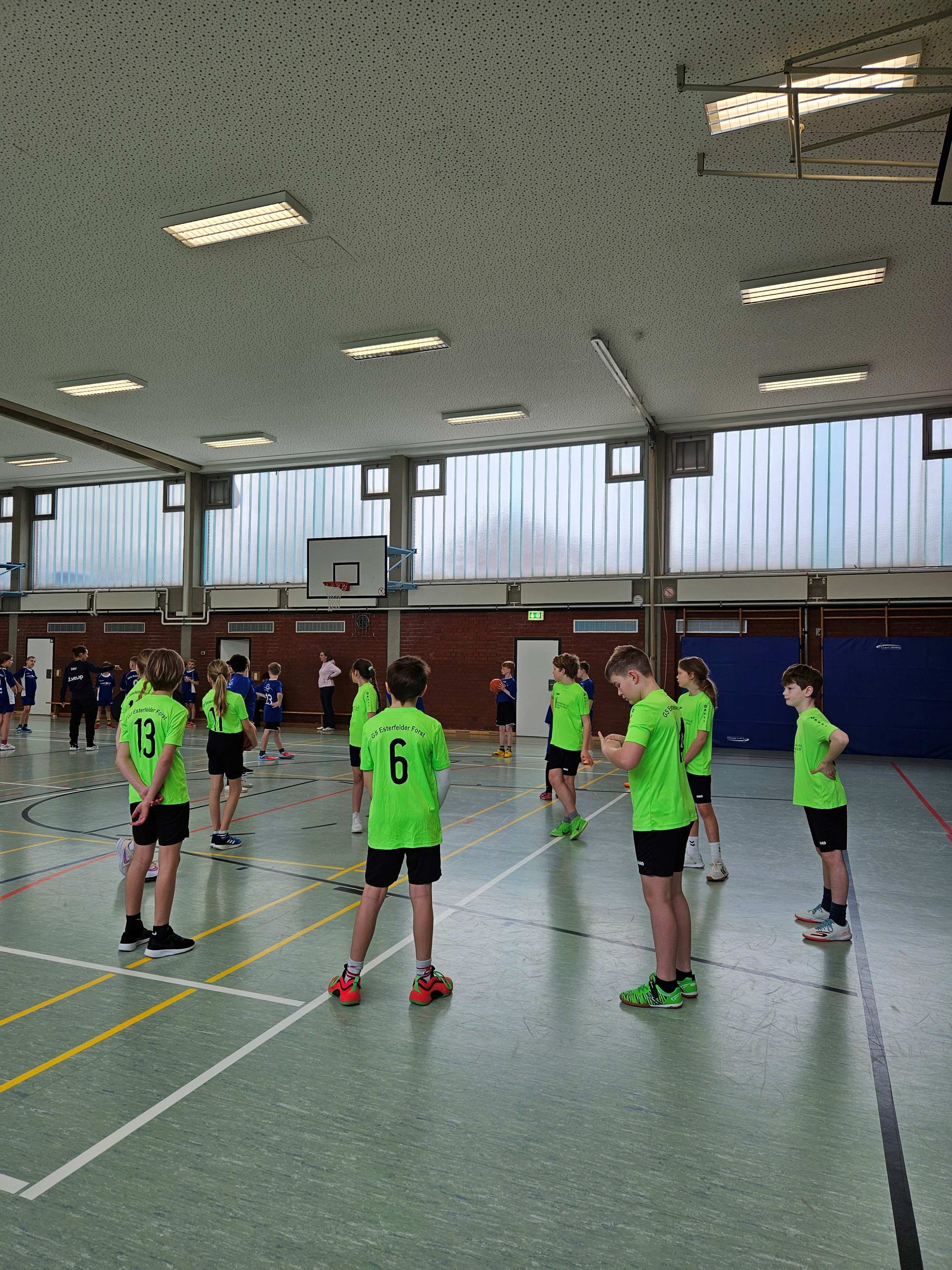 Nach einem gemeinsamen Aufwärmen wurde im Modus „Jeder gegen Jeden“ gespielt und um den Einzug in das Finale gekämpft. Dabei waren alle Teilnehmenden höchst motiviert und jeder Punkt wurde ausgiebig gefeiert. Bis zur letzten Sekunde gaben die SchülerInnen sichtlich alles. Unsere Gegner waren die Georgschule Haren, die Grundschule Bokeloh, die Grundschule Fullen sowie die Maria-Montessori-Schule.